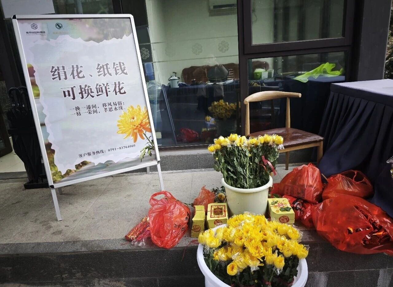 今年,园区继续倡导“无烟祭扫、文明缅怀”,园内各处悬挂文明标语、工作人员温馨提醒;园内还开设“绢花、纸钱换鲜花”爱心服务点,倡导市民鲜花寄哀思。